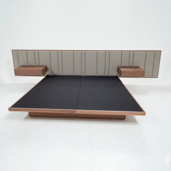 以飯店級視角重新定義臥室,懸浮感平台 床架搭配加長壁掛床頭板,拉出俐落水平線條,瞬間放大空間感。雙側懸空床頭櫃讓地面更清爽,也方便清潔。溫潤木皮結合中性色軟包,睡前靠躺閱讀同樣舒適。一張床,就完成臥室的收納、美感與儀式感。
