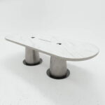 長形木紋桌面搭配深色三柱桌腳,為會議室帶來穩重而現代的視覺焦點,適合 8–12 人團隊策略討論與客戶簡報。 會議桌圓弧桌角設計降低碰撞風險,長時間會議也能自在移動。 穩固三柱結構能承載多組螢幕與視訊設備,保持桌面穩定。 耐磨木皮或木紋材質易於清潔保養,滿足高頻率使用的商務空間需求。