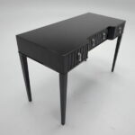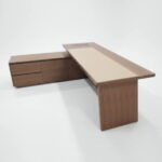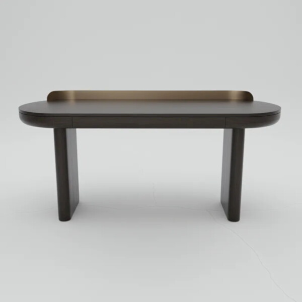 木紋搭配檯面鈦金擋板,為空間注入安定而優雅氣場。 書桌厚實實木桌板與簡潔立板腳型,構成俐落的現代輪廓,穩固承載你的每一次專注。 隱藏式抽屜收納設計讓桌面始終乾淨,無論是居家書房、辦公室, 辦公桌都能成為第一眼被看見的品味焦點。
