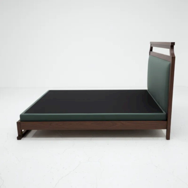 胡桃木色框架搭配墨綠軟包,這張床把東方線條與現代極簡融合得剛剛好。 大面積軟包床頭讓你晚上靠著看書、追劇時能穩穩被支撐,床沿同樣包覆軟墊,坐在邊緣整理物品也不會不舒服。 上方鏤空木橫桿像一筆畫過的窗景,替臥室多添一點設計感。 若你喜歡安靜、有溫度的睡眠場景,這張床非常適合。