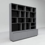 以垂直金屬線條勾勒出俐落格柵感,淺木紋層板溫潤中帶有都會感, 置物架多層架構可輕鬆陳列大量書籍與收藏。中段收納櫃體巧妙隱藏雜物,維持視覺整潔。通透設計也適合作為空間隔間,讓閱讀、展示與收納,在同一座架子上優雅共存。