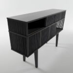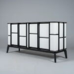 純黑木質與細密柵格組成俐落線條,高腳結構拉高視覺重心,讓櫃體看起來輕盈又有設計感。上層開放格方便擺放日常小物,下層柵格門則巧妙隱藏凌亂,適合玄關、走道或客廳牆邊使用。瘦長比例不佔空間,卻替居家加入具有存在感的低調主角。