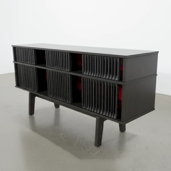 黑色外表隱藏紅色內背板,打造如畫廊般的光影層次,在冷靜中隱含狂熱,讓每一件收藏都成為主角。 餐邊櫃直條柵格門設計,若隱若現地遮蔽雜物,同時維持通風與視覺輕盈。上下雙層大容量與高腳結構,無論是玄關收納、客廳展示,或當餐邊櫃,都能俐落融入各種現代空間。