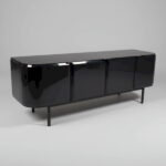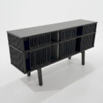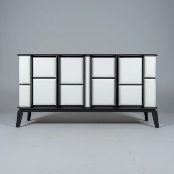 以黑色框架勾勒白色方格立面,彷彿縮小版現代建築,讓 邊櫃成為空間的藝術裝置。細長高腳抬升櫃體,視覺輕盈也方便清潔。長型檯面可擺放畫作與花器,下方封閉式櫃門則完整收納餐具、書籍與雜物,適合客廳主牆、餐邊櫃或玄關展示櫃使用。