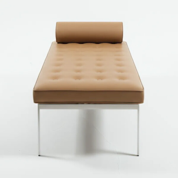 以奶茶色皮革包覆全長坐墊 長凳,搭配規律拉扣壓車線與纖細金屬腳座,這張現代臥榻在輕盈線條中展現高級感。附帶圓筒頭枕,可依需求當腰靠或頸枕,讓短暫休息也成為儀式。放在客廳窗邊、床尾或玄關,既好坐又好看。
