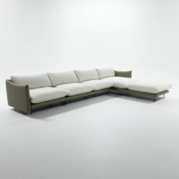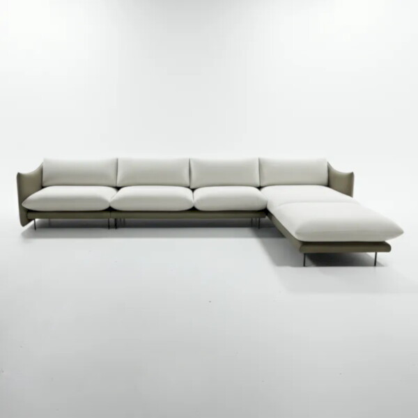 灰綠框架襯托潔白厚坐墊,這款 L型沙發以流線扶手與伸展躺腳,帶來全家共享的極致舒適。纖細金屬腿架放大空間感,布面親膚耐髒,無論追劇、午休或聚會,都輕鬆應對。現代簡約風格融入開放客廳,讓每刻休憩都充滿質感與自在。