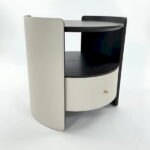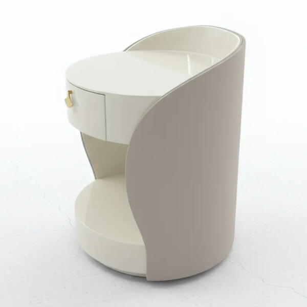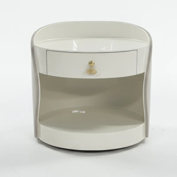 淺灰皮革圓弧外框包覆白鋼烤圓形 床頭櫃,讓這款床頭櫃在簡潔中流露柔和氣質。金色銀杏把手為整體增添精緻細節,上層抽屜方便收納小物,下層開放空間則讓置物更靈活。無論搭配現代、北歐或輕奢臥室,都能自然提升床邊質感,讓空間看起來更乾淨、更有品味。